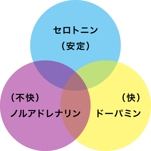 セロトニンには、アドレナリンとドーパミンの2つが過剰になって暴走しないように、調節する働きがあります。