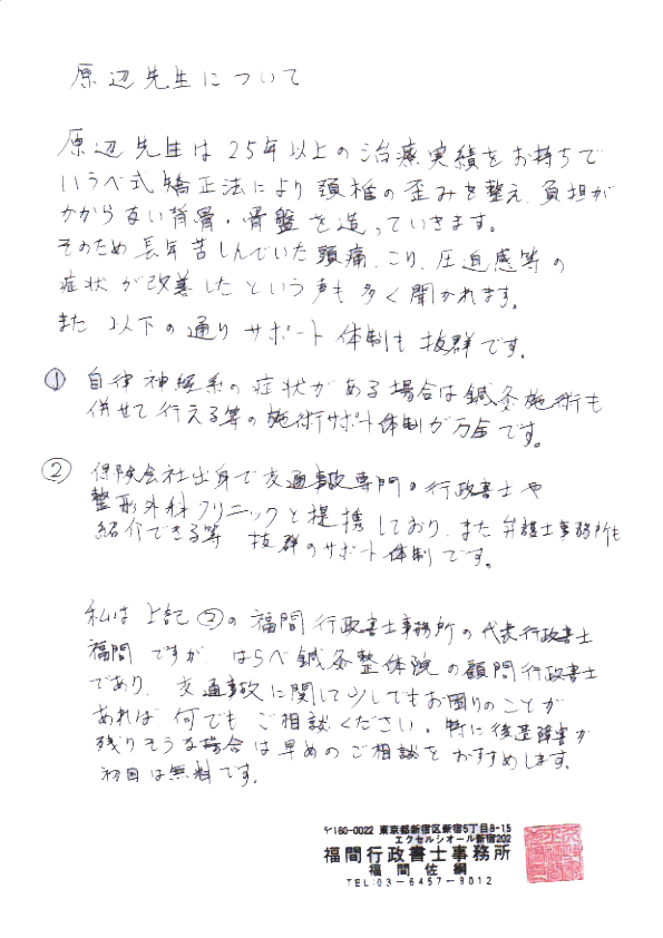 交通事故専門行政書士から推薦状